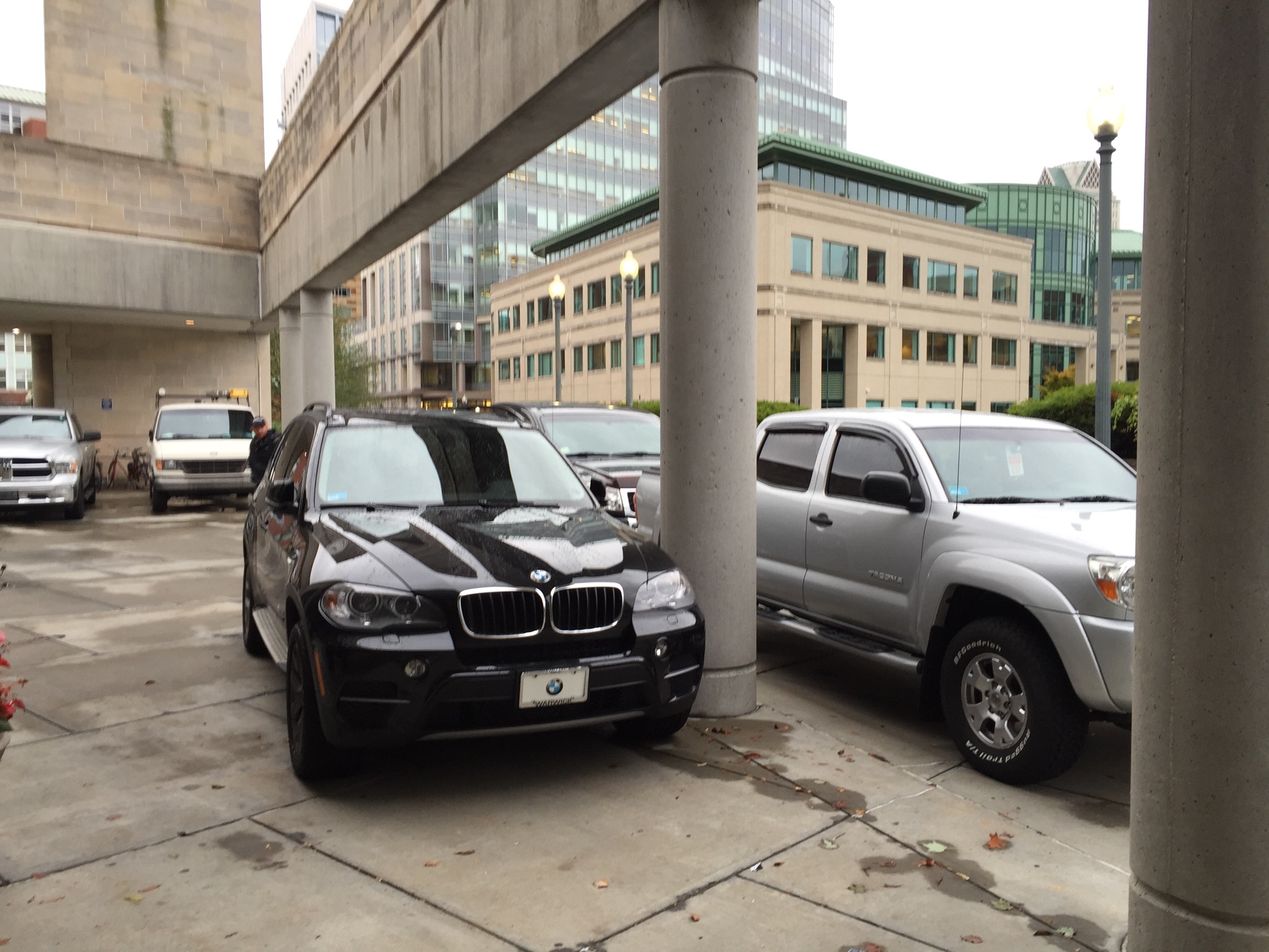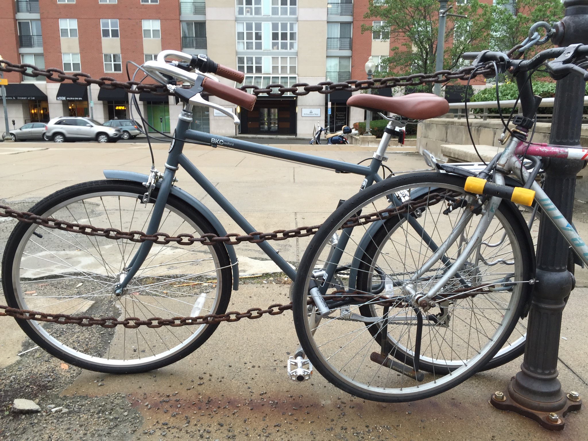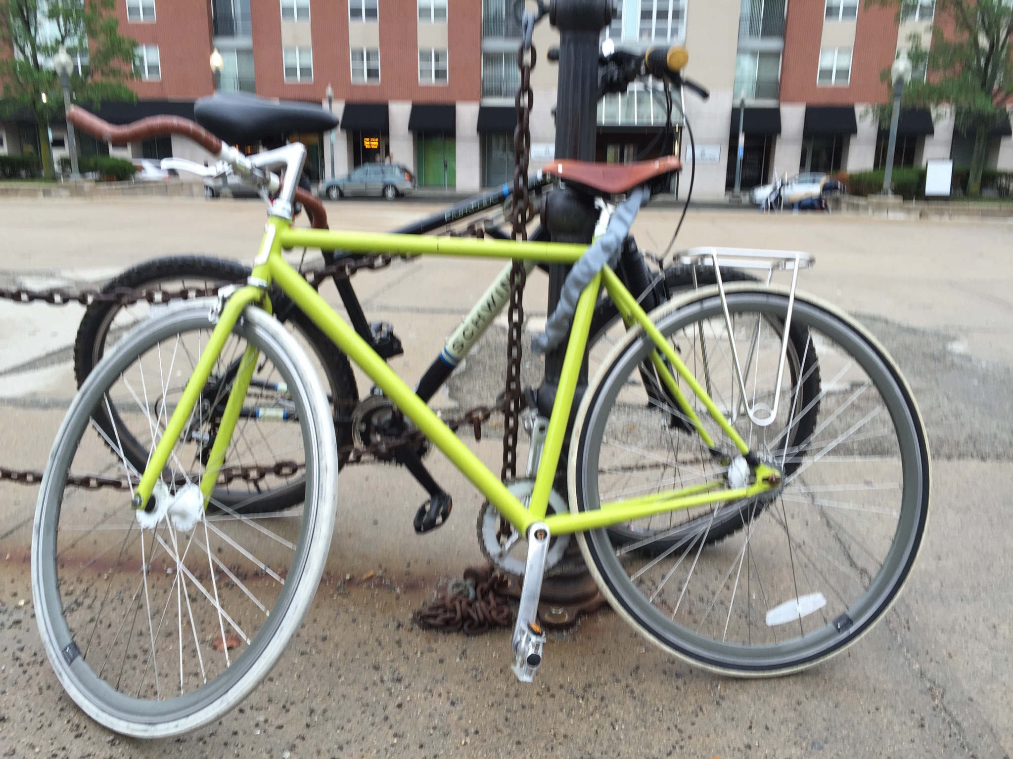 This Schwinn and Raleigh were right next to each other on the rack. They’re ostensibly supposed to be city bikes; they’re basically the same variation of the hybrid shape–which I’ve never really understood. It’s a hybrid of mountain and … road? Because these are really just mountain bikes with slightly less terrible bars. The Schwinn even has a rack. And here’s something else they both share: