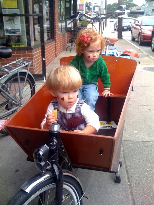 Then we realized we could bike right up to sidewalk seating and use the bakfiets as a pack-and-play on wheels. It is brilliant. S and I can sit at a table, feed them, eat ourselves—all with no to limited struggling! Any meal with limited struggling is a meal from heaven. Plus, they can drop all the food they like in the bike and we only have to hose out the bigger chunks so the squirrels in our garage have no incentive to come down from their rafters.