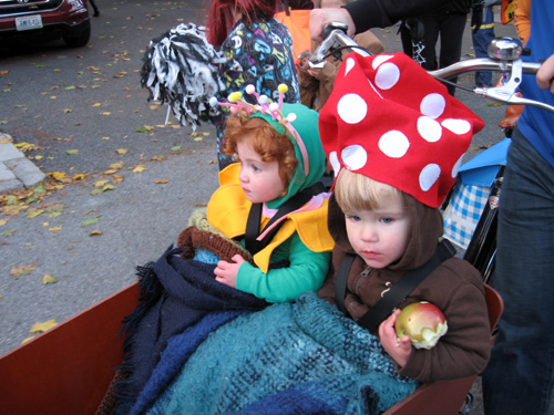 Halloween parade! G is a flower; R is a mushroom. We rode to the parade, milled around in the park, admired costumes, then bundled up in the bike for a walk in the parade. Rode home, despite the temperature having fallen what felt like 20 degrees in two hours. Probably the last trip without the cover until spring.